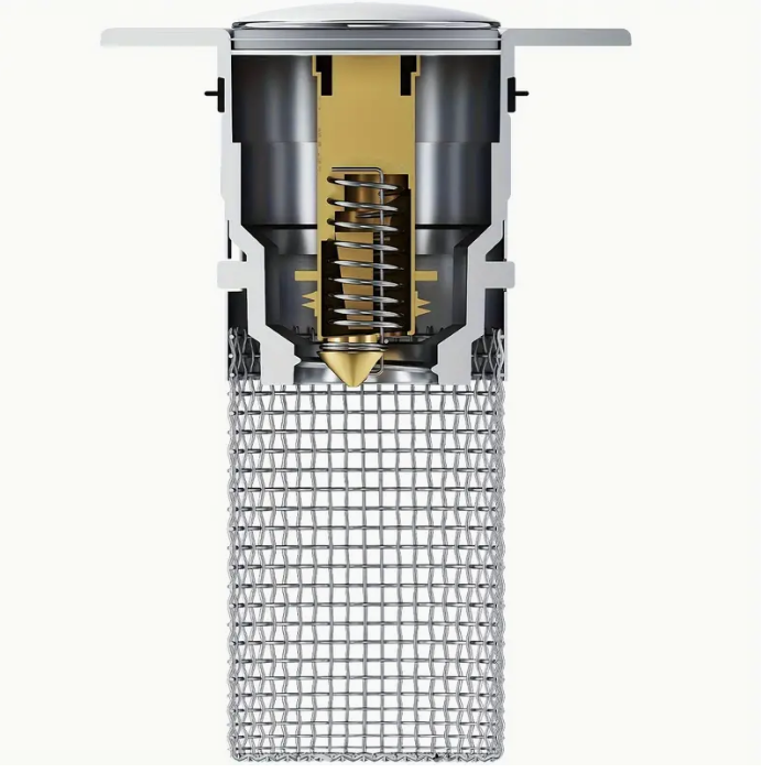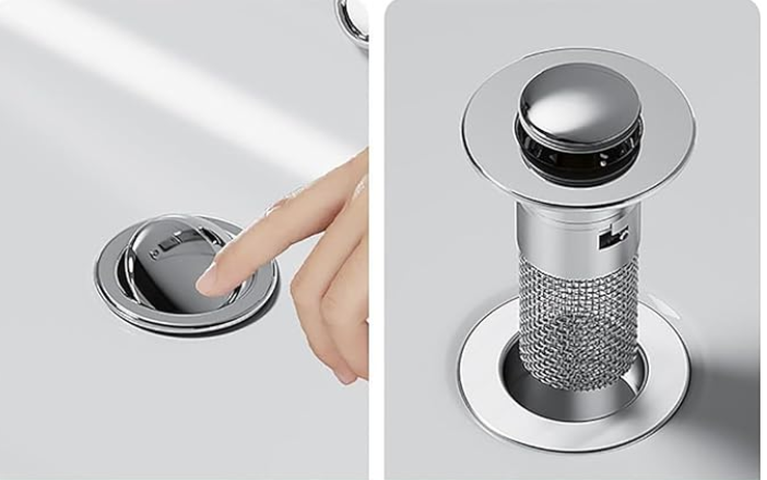 🟥 Mecanismo Emergente: Permite abrir y cerrar el tapón con un simple empuje, facilitando el control del flujo de agua.