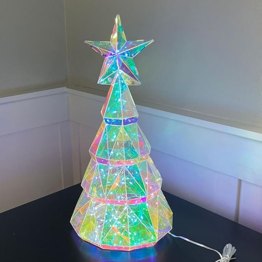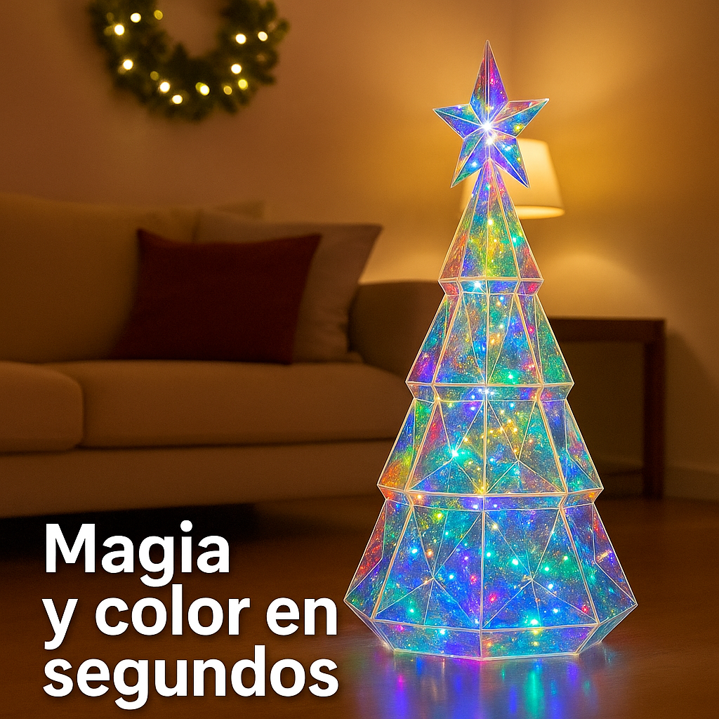 El árbol cuenta con luces LED RGB integradas que se reflejan en paneles acrílicos prismáticos, creando un efecto holográfico de colores cambiantes. Puedes ajustar el modo de iluminación con el control remoto o directamente desde el botón de encendido.