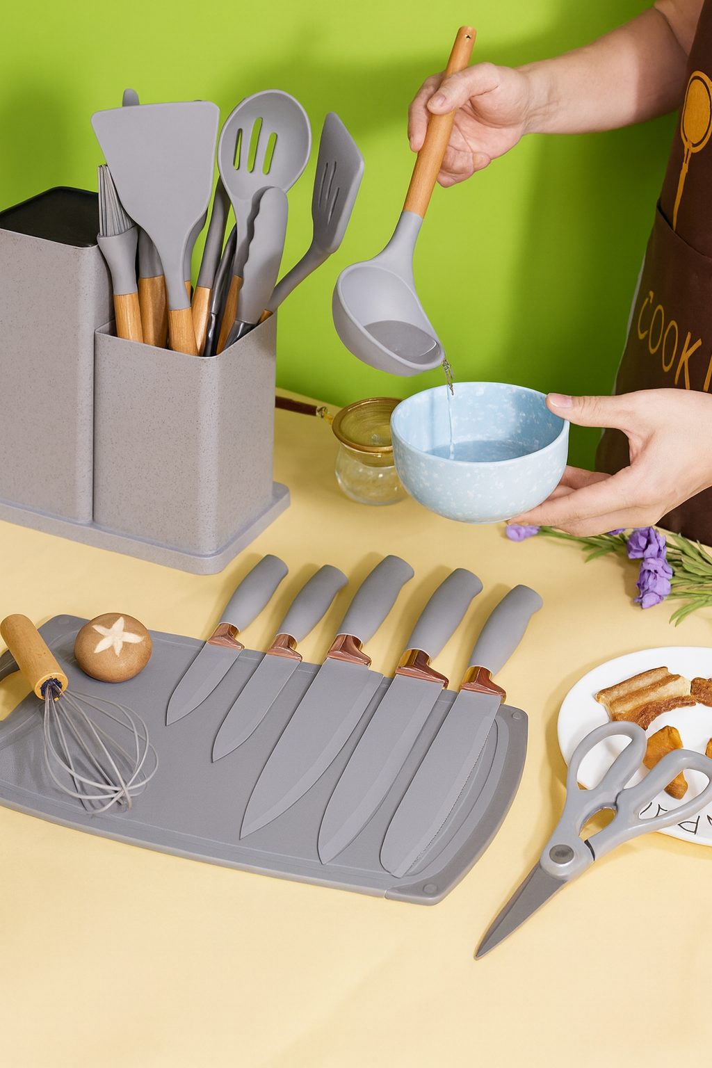 El set incluye 19 piezas completas, entre cuchillos, espátulas, cucharas, pinzas, batidor y soporte organizador.