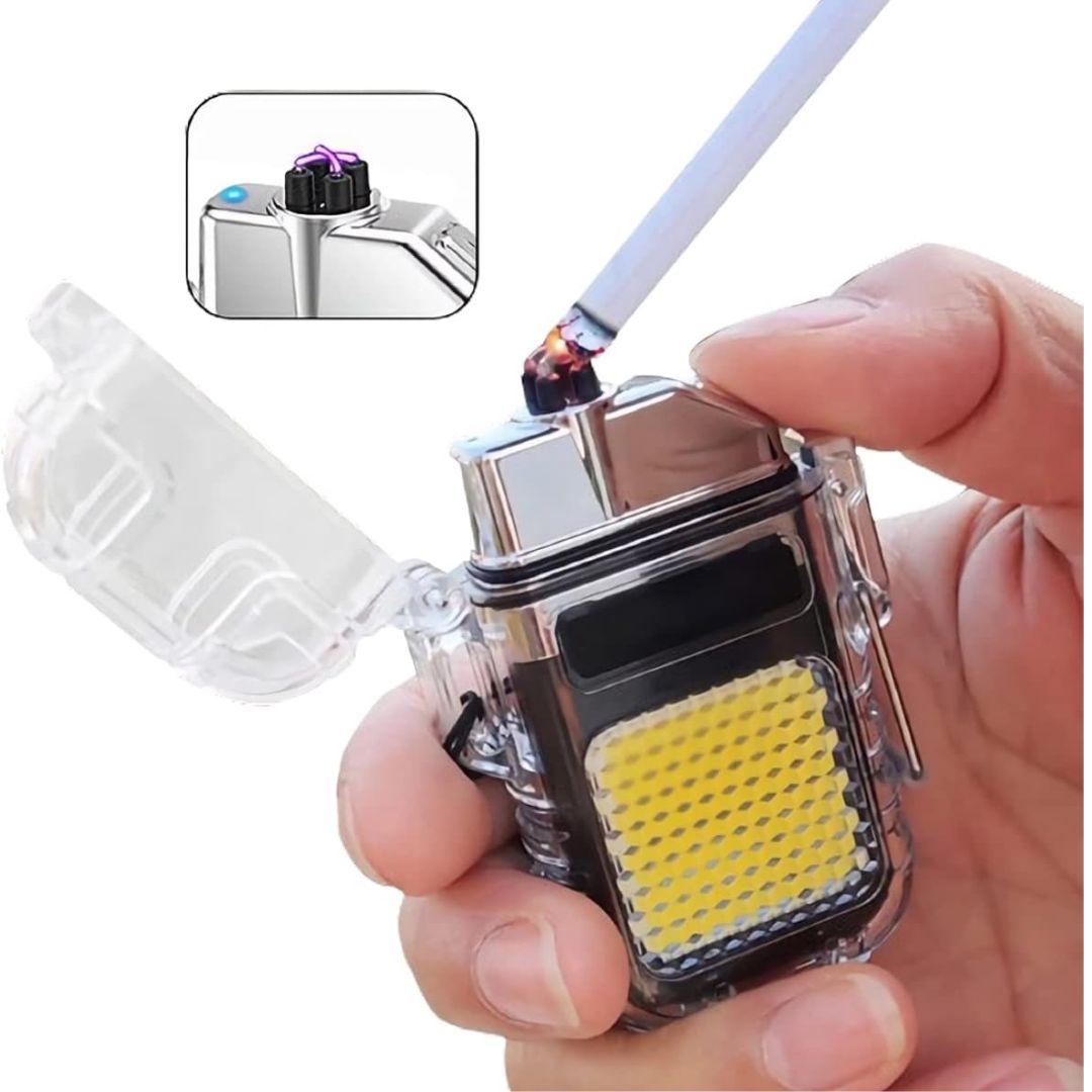 Encendedor eléctrico de arco recargable, resistente al agua y viento, con linterna LED integrada. Compacto, seguro y ecológico, ideal para camping, senderismo y aventuras al aire libre. Carga rápida, diseño duradero y versátil. ¡Tu compañero perfecto en cualquier clima!