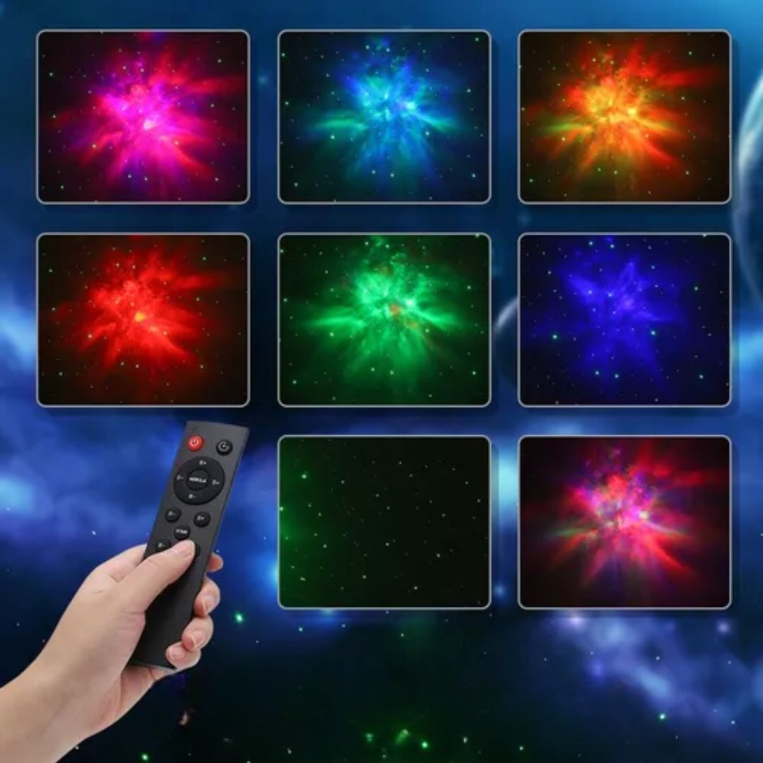 • Usa los botones de control o el remoto para alternar entre colores, patrones y efectos de nebulosa o estrellas.